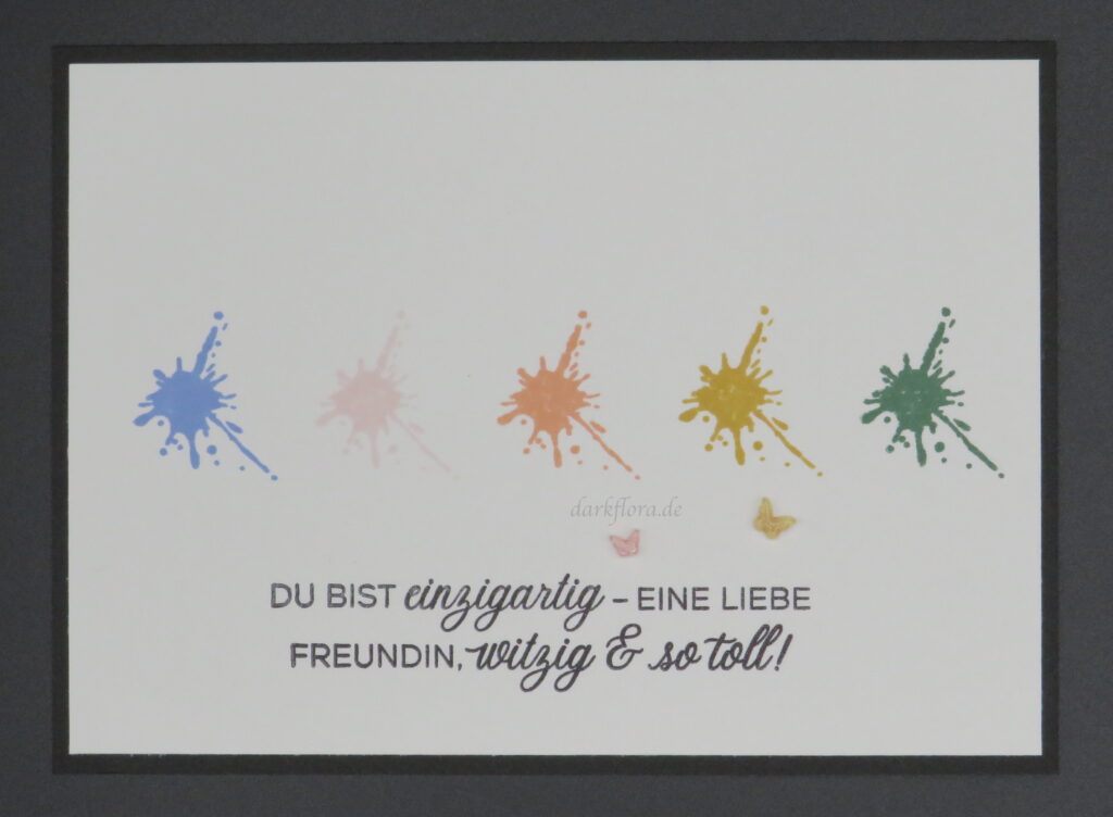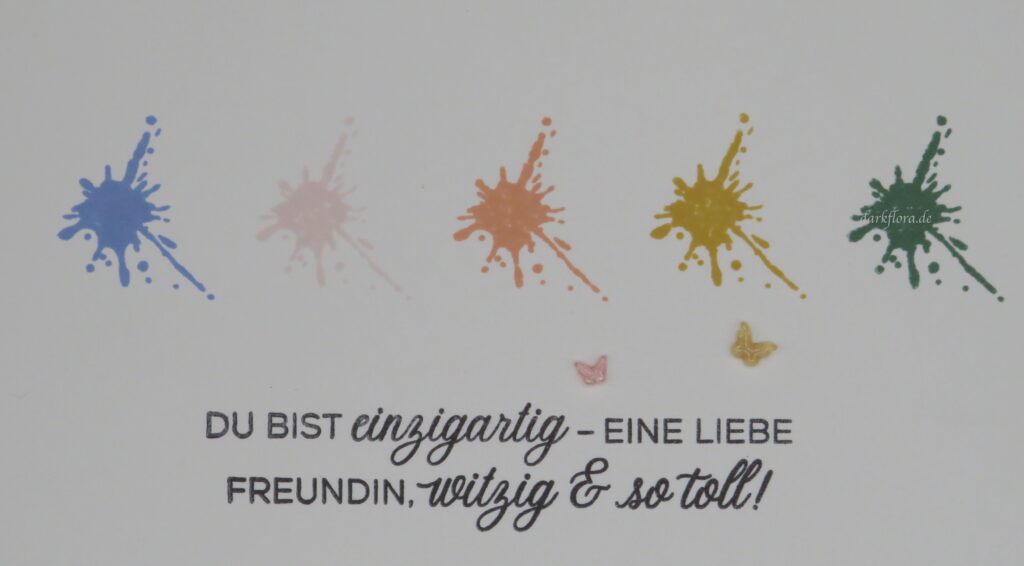 Die Kleckse habe ich mit einem Stempel aus dem Set „Gears & Textures“ gestempelt und der Spruch stammt aus dem Set „Grüsse und Rahmen“.