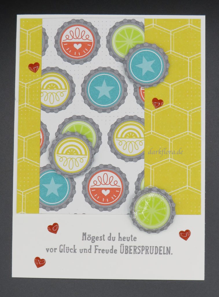 Bei dieser Karte habe ich aus dem Designerpapier mit Hilfe der Stanzen aus dem Produktpaket „Auf dich“ ein paar Kronkorken ausgestanzt.