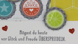 Bei dieser Karte habe ich aus dem Designerpapier mit Hilfe der Stanzen aus dem Produktpaket „Auf dich“ ein paar Kronkorken ausgestanzt.