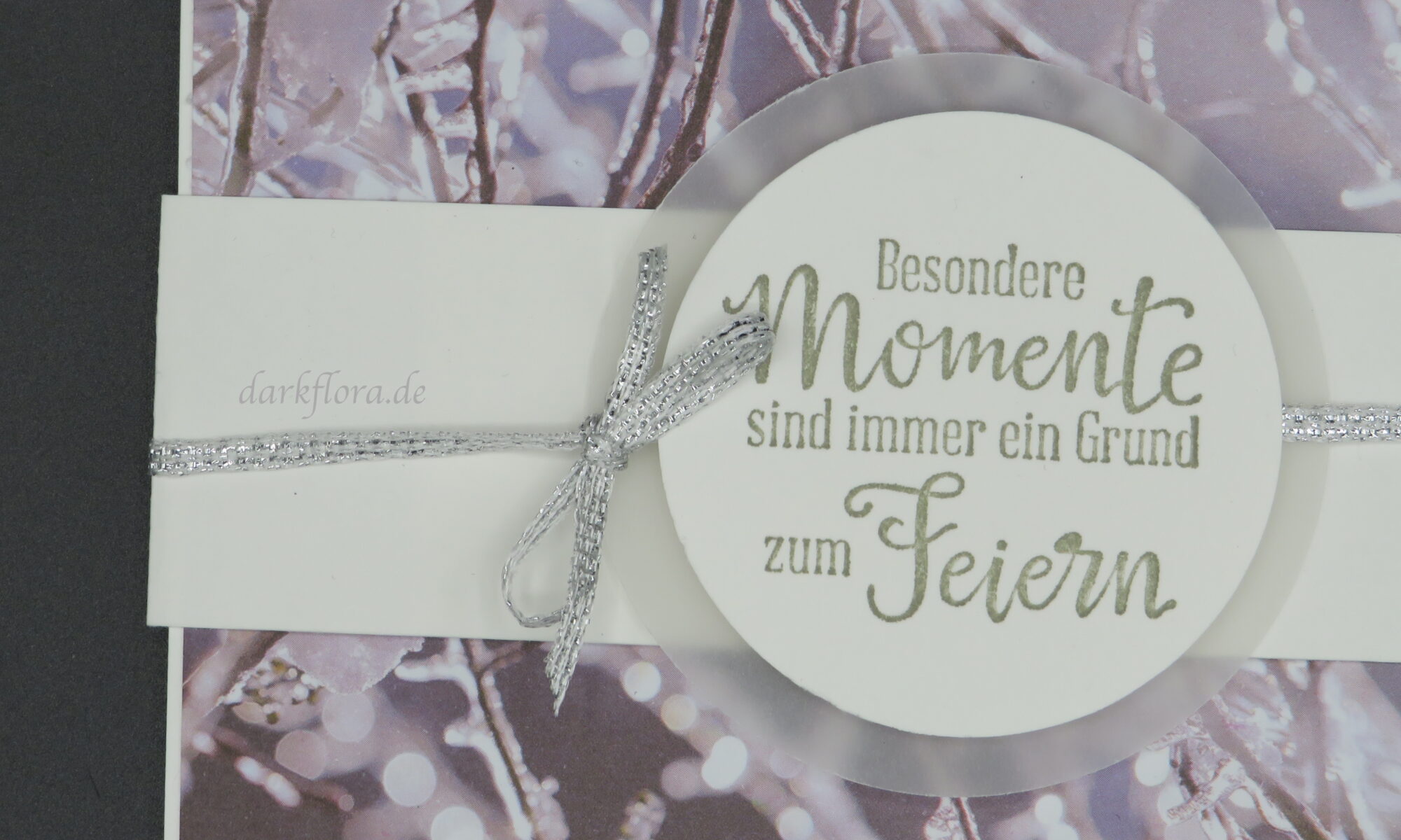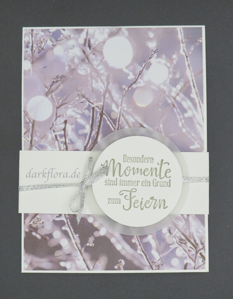 Ich habe mich für ein winterliches Motiv aus dem Designerpapier „Winterzauber“ entschieden und habe dazu die Grüße aus dem Set „Besondere Momente“ verwendet.