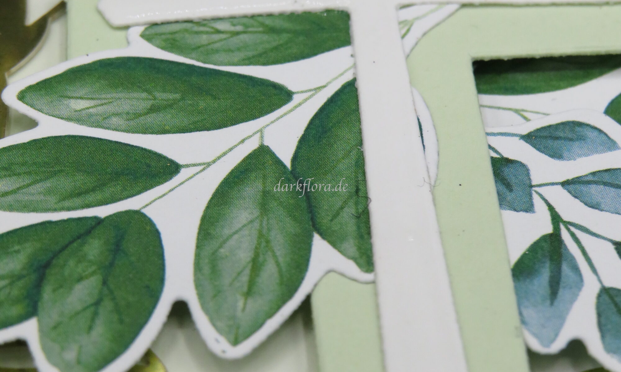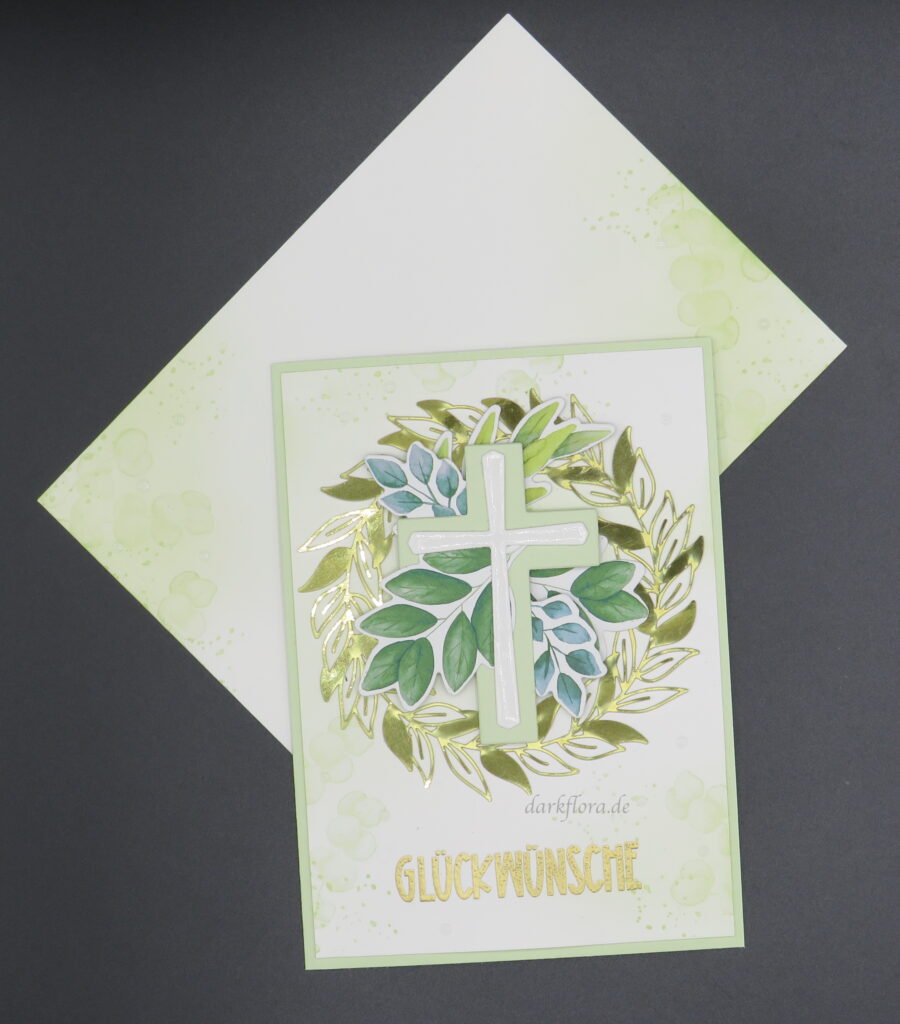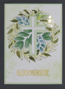 Das Kreuz habe ich mit den Stanzen „Kreuz der Hoffnung“ ausgestanzt. Die Blätter habe ich aus dem Designerpapier „Ewiges Grün“ mit den passenden Stanzen „Ewige Zweige“ ausgestanzt. Passend dazu konnte ich den goldenen Blätterkranz aus dem Designerpapier „Ewiges Gold“ verwenden.