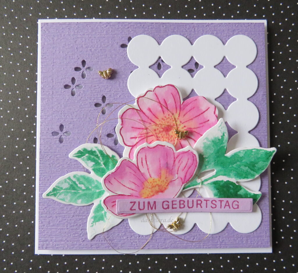 Für meine Karte habe ich die Blüten aus dem Set „Liebevoll Arrangiert“ auf Aquarellpapier gestempelt und dann mit Stempelfarbe und einem Wassertankpinsel koloriert.