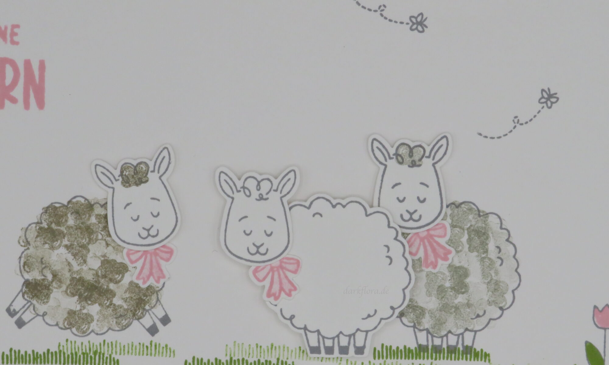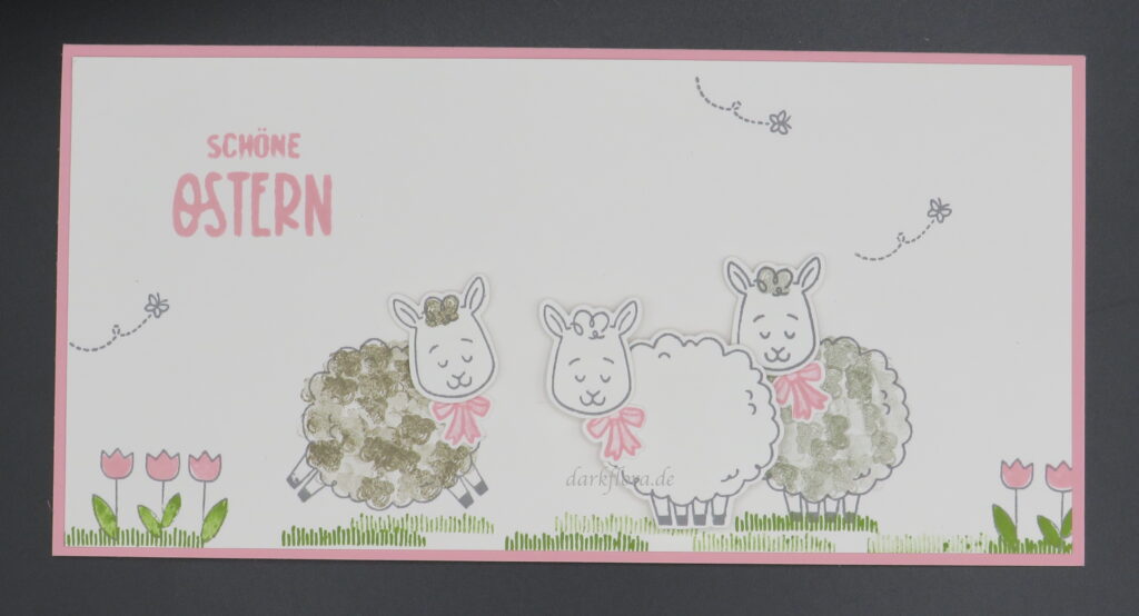 Dazu habe ich ein paar Blümchen und Schmetterlinge gestempelt, damit die Schafherde auf einer schönen Wiese steht.
