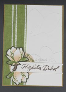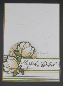 Bei dieser Karte habe ich ein Stück Designerpapier im unteren Bereich über den geprägten Aufleger geklebt und darauf den Spruch und die Magnolien geklebt.