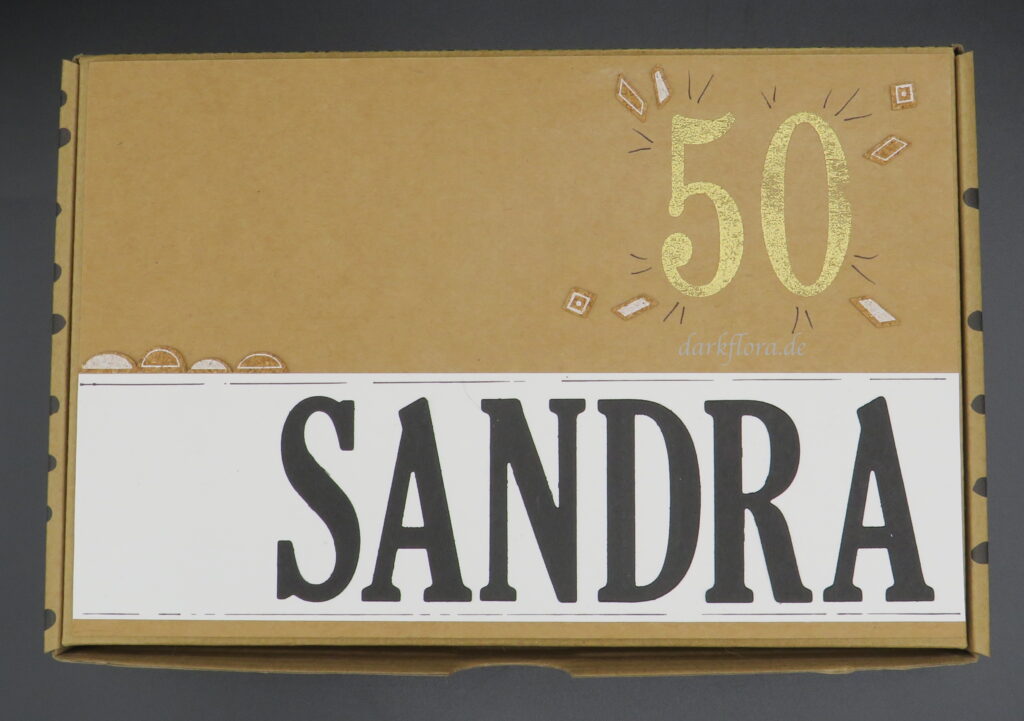 Ich habe die 50 direkt auf der Box in Gold embosst und den Namen mit den „Letters for You“ ausgestanzt und aufgeklebt.