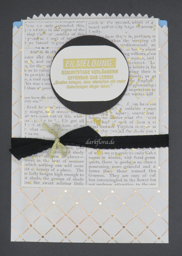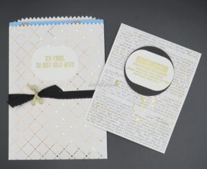 Passend zu der Karte, die ich euch am Samstag gezeigt habe, habe ich ein Tüte aufgehübscht, in der sich passend zu dem Thema „Du bist Gold wert“ eine Gesichtsmaske und Augenpads in Gold verstecken.