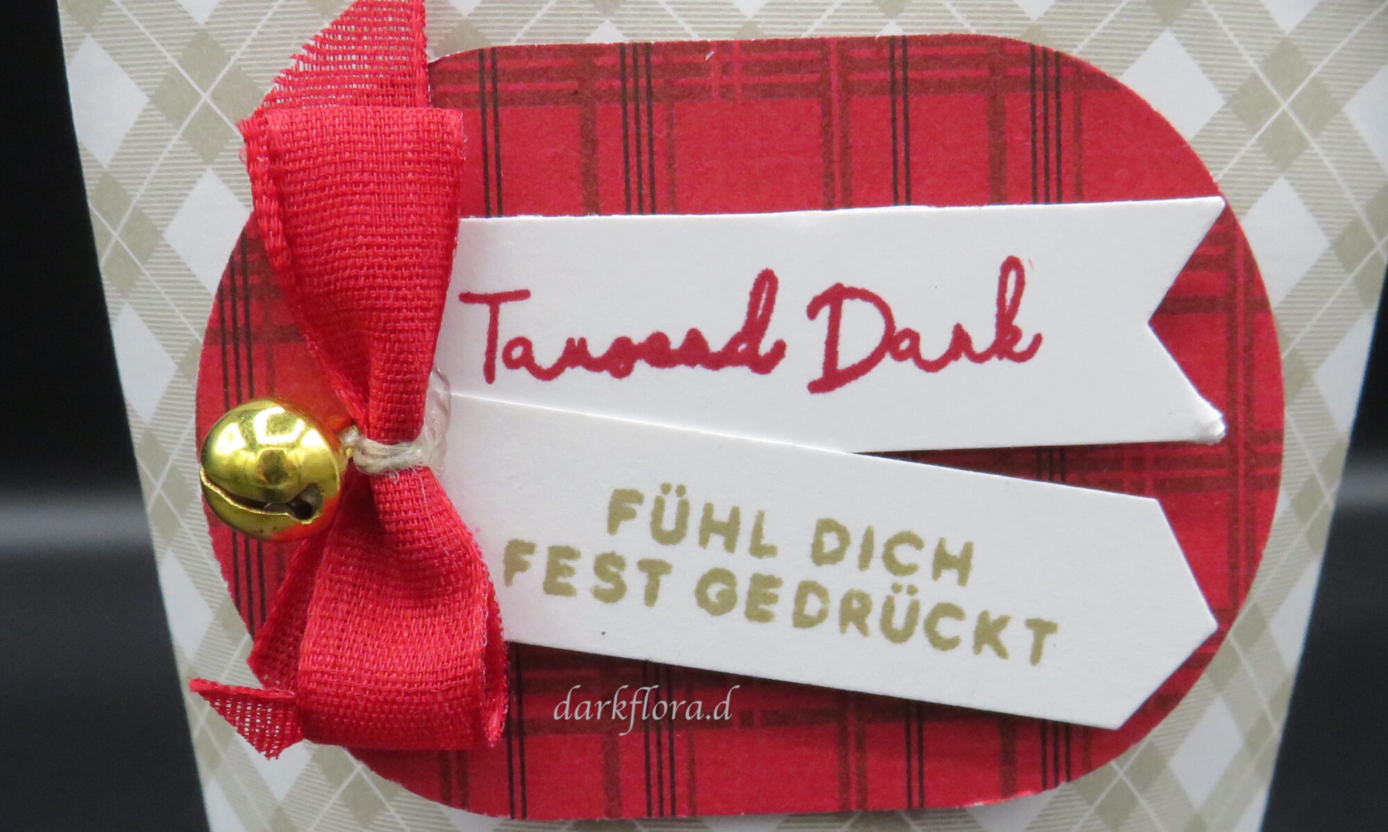 Für die Dekoration habe ich ein Label ausgestanzt und darauf zwei Sprüche aus dem Set „Fähnchen-Grüße Bundle“ mit der passenden Handstanze ausgestanzt.