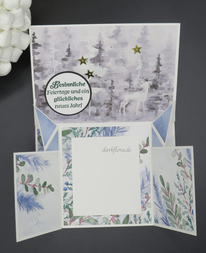 Von außen ganz schlicht, durch das schöne Designerpapier „Magischer Winter“. Ich habe nur den Schriftzug aus den Stanzen „Grüße für die Feiertage“ dazu kombiniert, das dank der tollen Klebebögen ganz einfach geht.