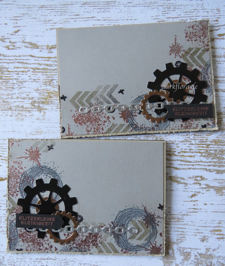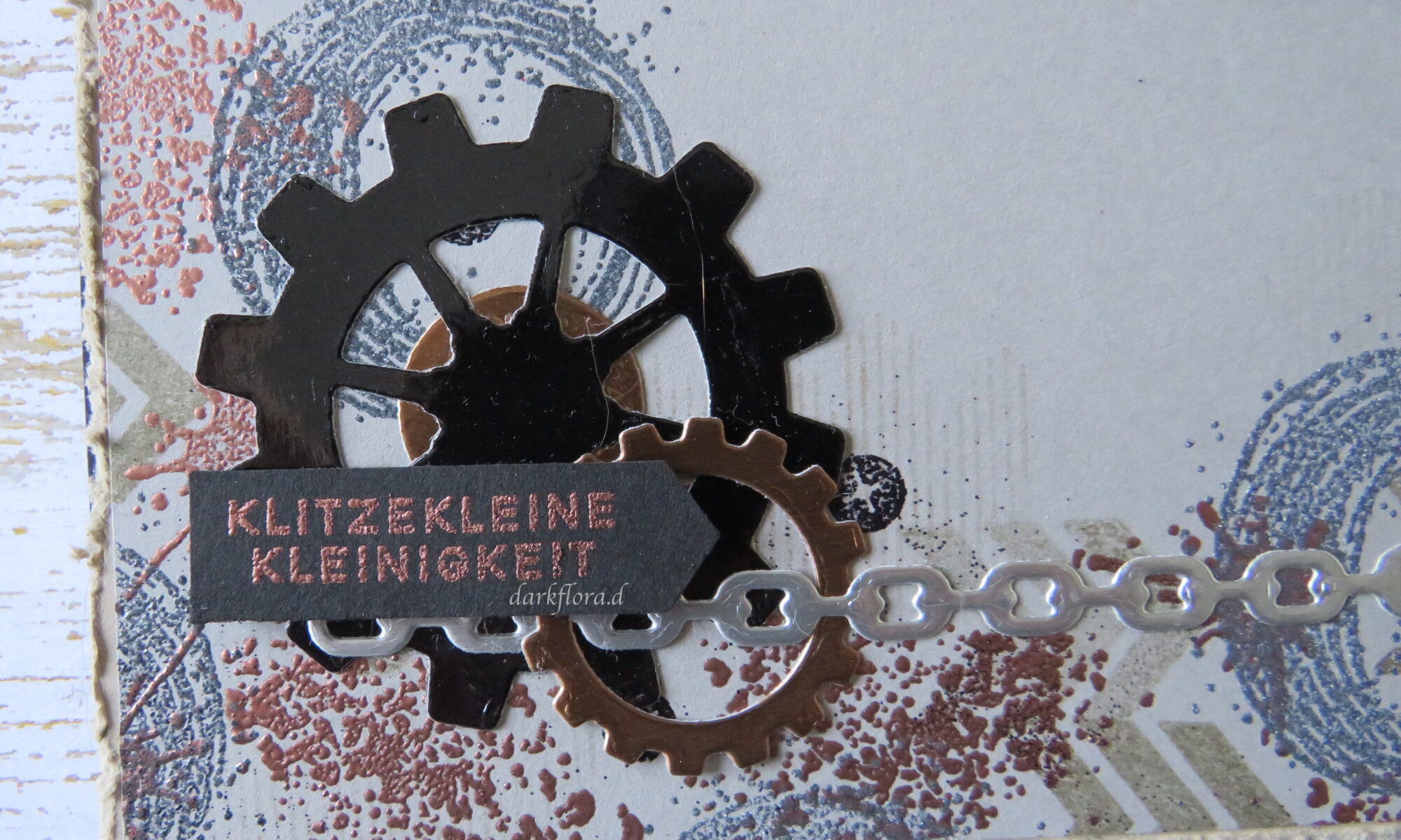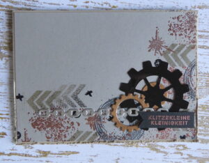 Ich habe einen Bogen A4 Karton mit dem Set „Zahnräder & Texturen“ bestempelt und in unterschiedlichen Farben embosst. Danach habe ich den Bogen in 4 Teile geschnitten und den Rand etwas angeraut.